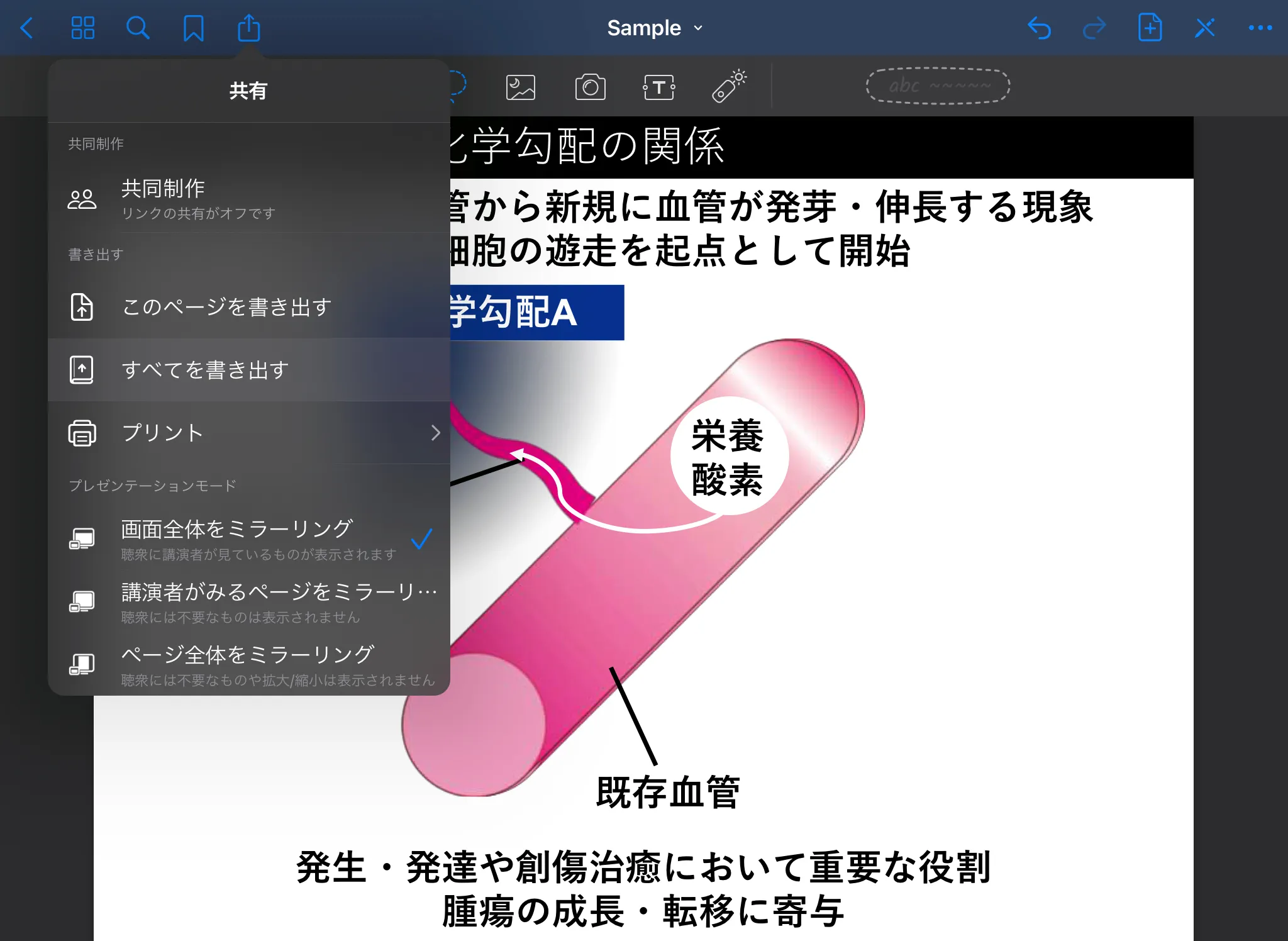 1. 「共有」をタップし,続いて表示される「すべてを書き出す」または「このページを書き出す」をタップします.「すべてを書き出す」を選択すると,全ページを資料化できます.「このページを書き出す」を選択すると,表示中のページのみを資料化することができます.