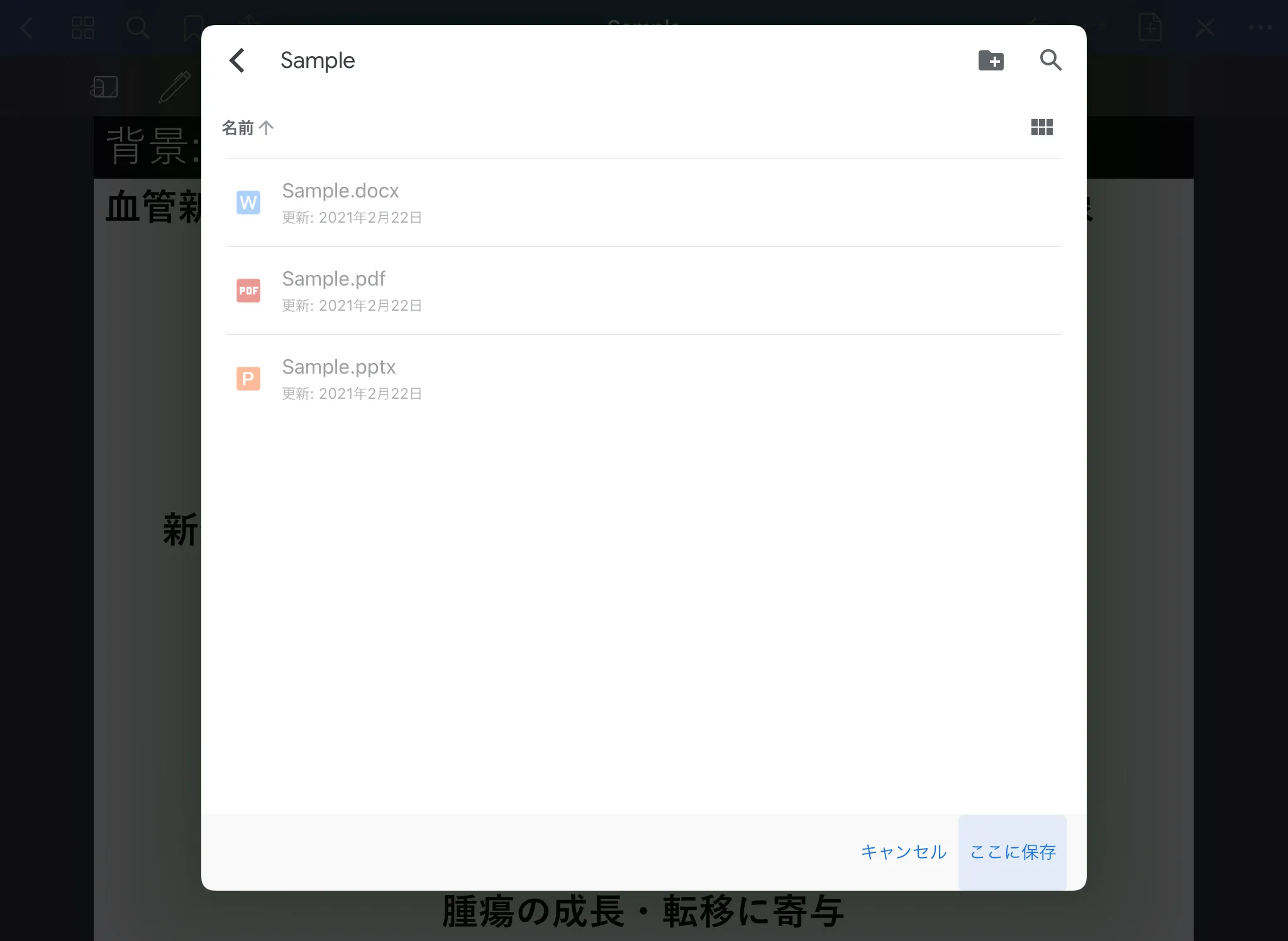 3. 書き出したファイルを保存または共有するためのアプリケーションを選択します.書き出したファイルは,Googleドライブに保存したり,Slackやメールで添付送信をしたりすることができます.本記事ではGoogle ドライブに保存する場合の手順を紹介します.