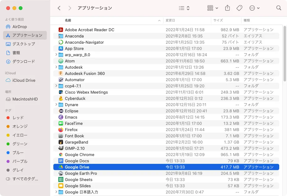 ECCS端末のMac環境では,Finder上でファイルやフォルダを操作するのとほぼ同様の感覚でGoogleドライブ上のファイルやフォルダを操作するためのアプリケーションを利用できます.このページではその使用方法を案内します.Windows環境では利用できません.