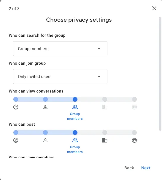 - Select the privacy settings and click “Next”. When configuring these settings, please make sure that internal information is not accessible to unauthorized individuals.