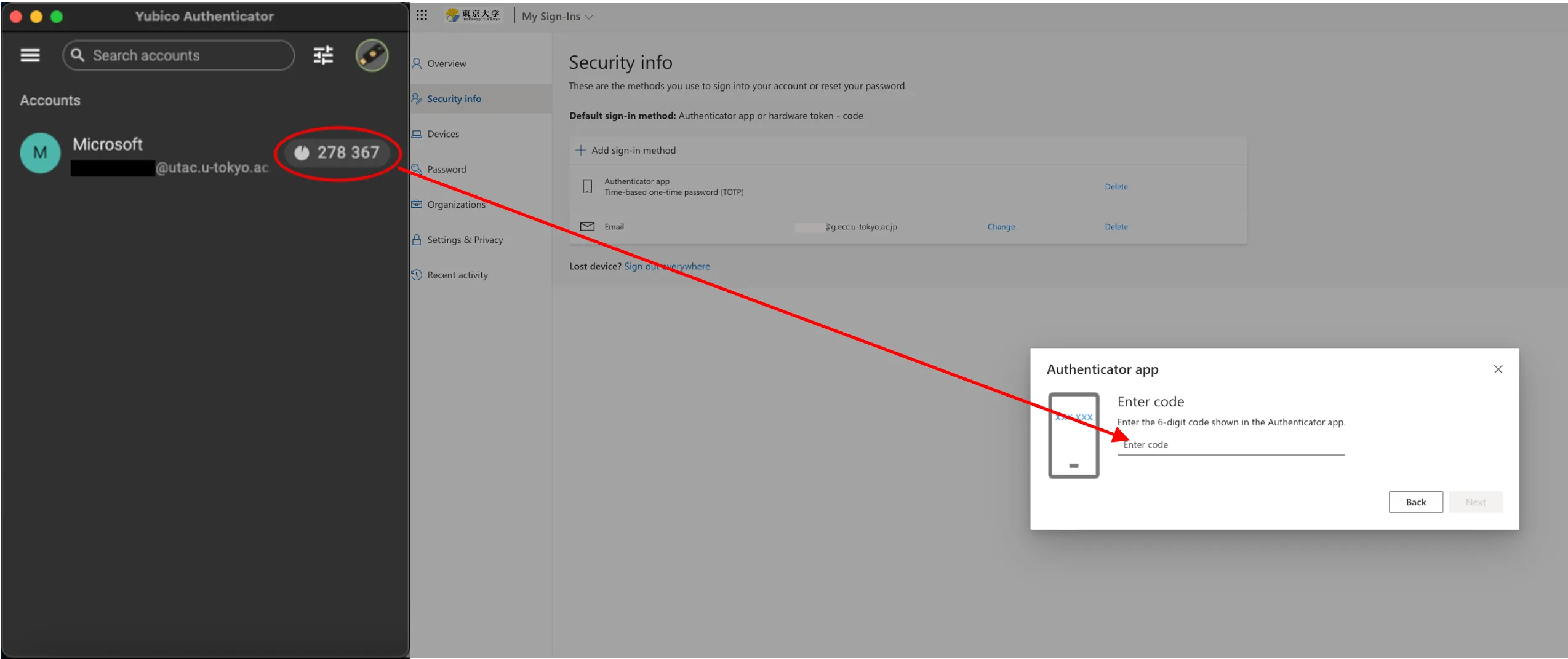 - When the “Enter code” field is displayed, please open the Yubico Authenticator application with YubiKey connected, check the 6-digit number shown in the app and enter the numbers into the input field.