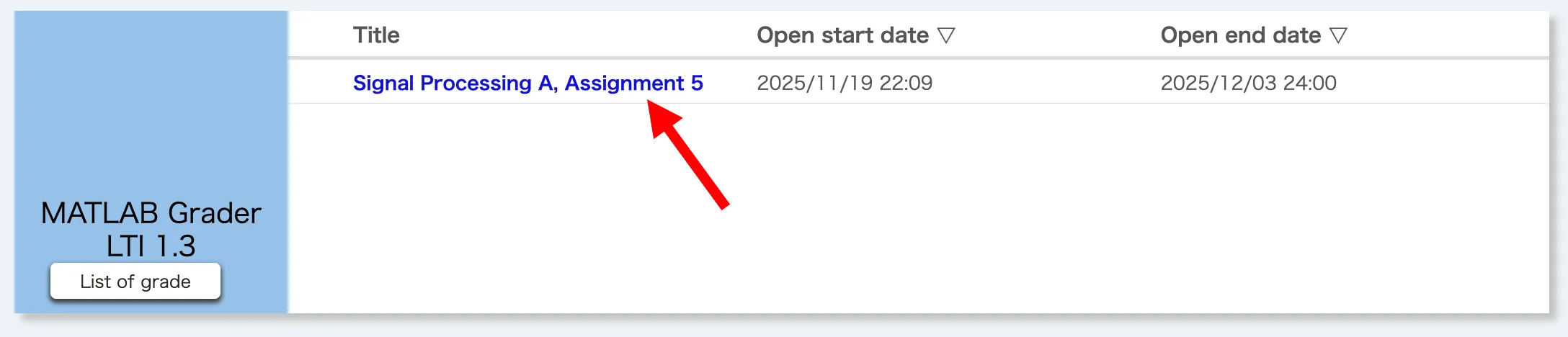 2. When you click on the title (in the above screen, “Signal Processing A, Assignment 5”), it transitions to the following screen, displaying details such as the content and the publication period. Check the “Content”, etc., and click on “Link to MATLAB Grader LTI 1.3”. The MATLAB Grader screen will open in a separate tab (or window).