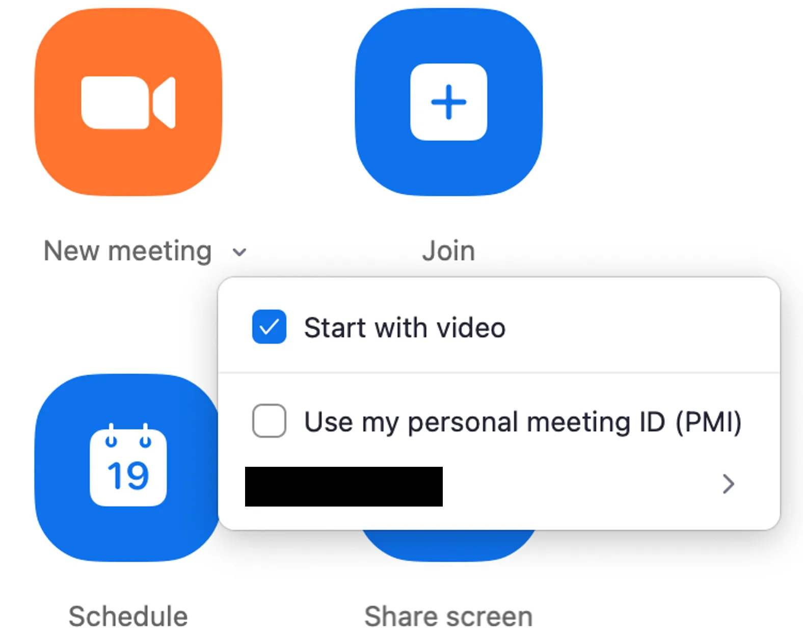 2. Press “New Meeting”. There are two types of meeting IDs used in this case: a random meeting ID (11 digits) and the “Personal Meeting ID” (10 digits). By default, a random meeting ID is newly generated each time and becomes invalid immediately after the meeting. On the other hand, if you want to use your personal meeting ID, please press the ”∨” next to “New Meeting” and check “Use my personal meeting ID”.