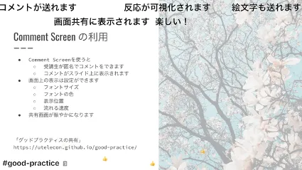 - Comment Screen: 匿名のコメントツール(授業内に学生からコメントしてもらうために利用)