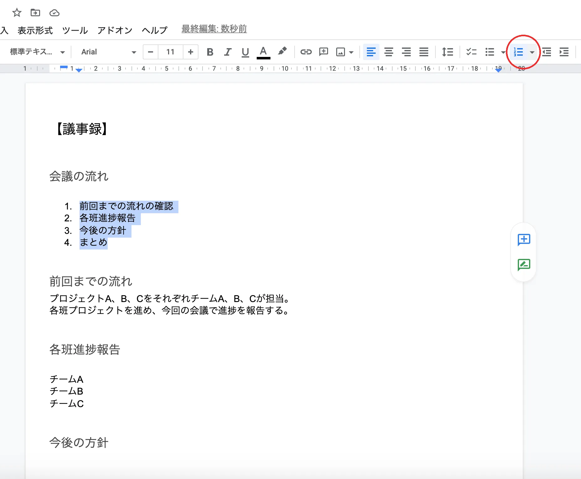 番号付けしたい箇所を選択し,ツールバーにある「番号付きリスト」を選択してください.