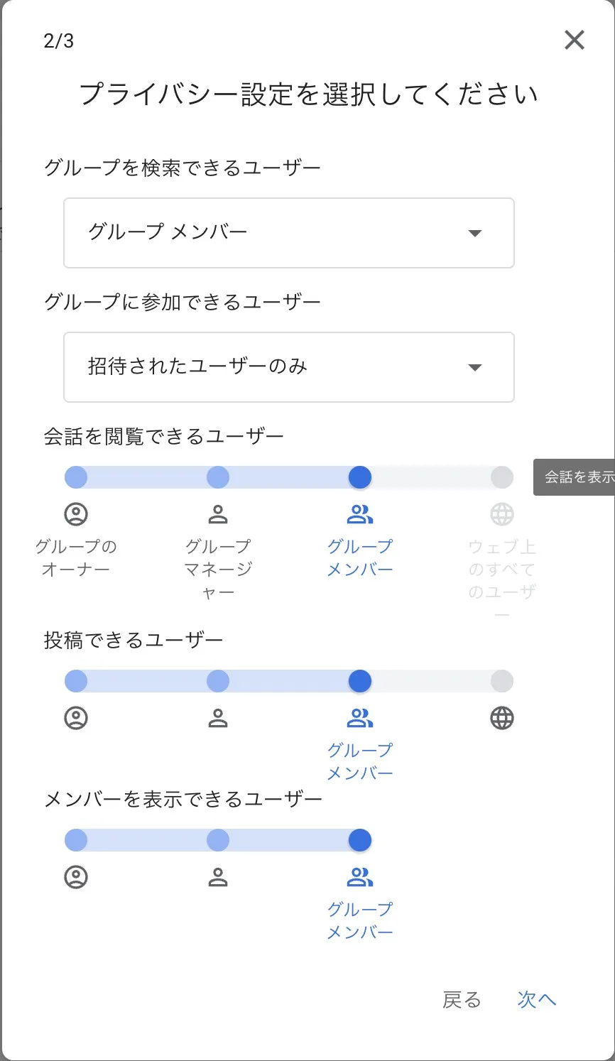 プライバシー設定を選択して,「次へ」を押してください.設定にあたっては,関係者以外が内部情報にアクセスできる状態にならないよう,注意してください.