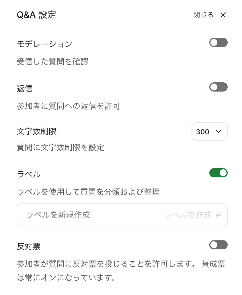 • ラベル:この設定をオンにすると,質問を分類・管理するためのタグ(ラベル)機能を使用できます.また,「ラベルを新規作成」欄から,新しいラベルを作成することができます.