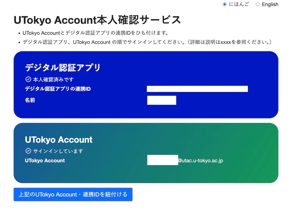 連携状況は,UTokyo Account本人確認サービスまたはUTokyo Account利用者情報確認サイト上で確認することができます.