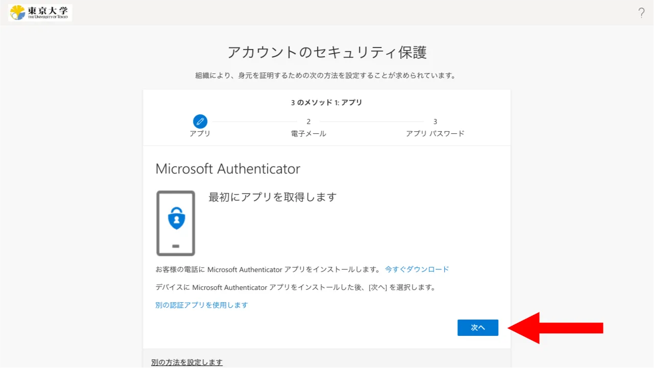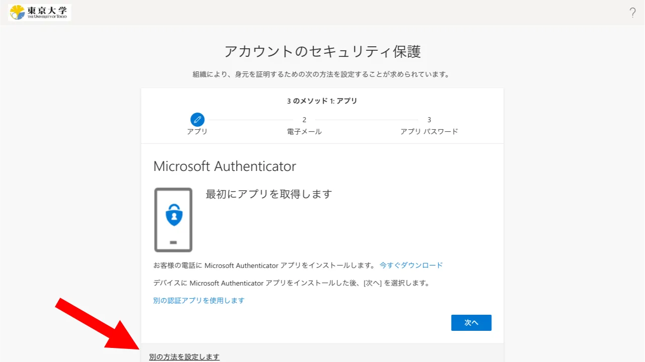 画面の中ほどにある「別の認証アプリを使用します」というリンクを探して押してください.