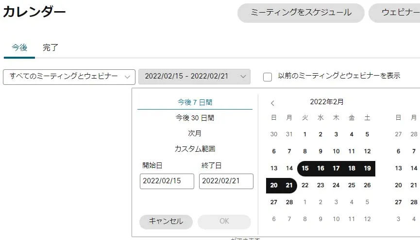 • ホーム画面には一週間以内に開催されるミーティング・ウェビナーが表示されます.それ以降のミーティングを選択したい場合はホーム画面左の「カレンダー」をクリックして,日付を指定して検索します.
