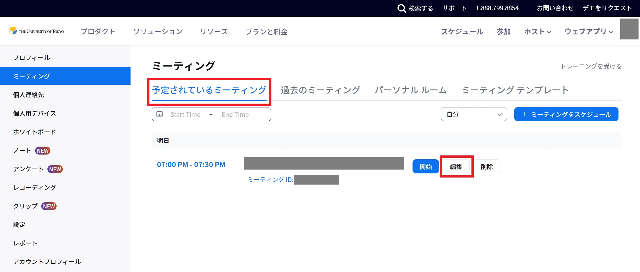 2. 新しくスケジュールするミーティングに代替ホストを設定する場合は「ミーティングをスケジュール」を選択してください. 既に作成したミーティングに代替ホストを追加する場合は,「予定されているミーティング」を選択し,一覧に表示されているミーティングにカーソルを合わせてください.新しく「編集」が表示されるのでこれを選択してください.
