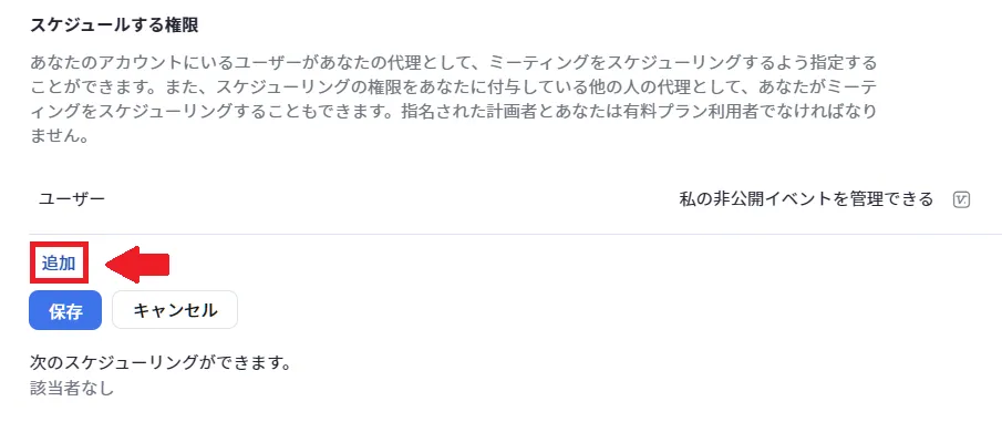 2. 「ミーティング」タブを選択し,「その他」欄の「スケジュールする権限」まで移動し,[追加]を選択してください.