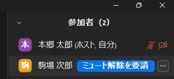 ホストが他の参加者に移動したあと(ホストの譲渡ホストキーの使用ホストの退出ホストの意図しないミーティング離脱などによる),元々のホストが再びホストに戻ることを希望する場合は,以下の手順でホストを回復することができます.この機能を実行できるのは,自分自身のミーティングについてのみであり,たとえば「代替ホスト」を設定されたことで他者のミーティングのホストになっていた場合は実行することはできません. ミーティング中の「参加者」欄に表示されている自身の名前にマウスを合わせ,表示されたケバブメニュー(「…」のアイコン)をクリックし,「ホストの再要求」を選択することで,再びホストに戻ることが可能です.