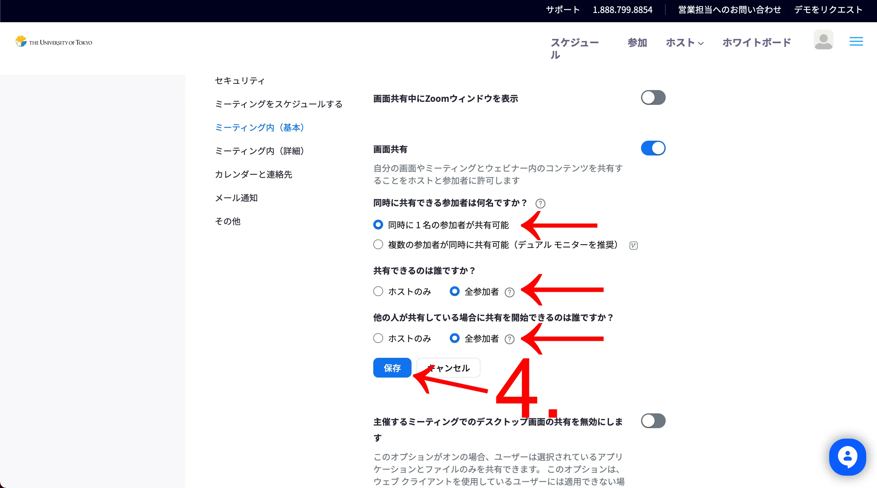 「画面共有」内の項目について,それぞれ以下のように選択して,「保存」を押してください.