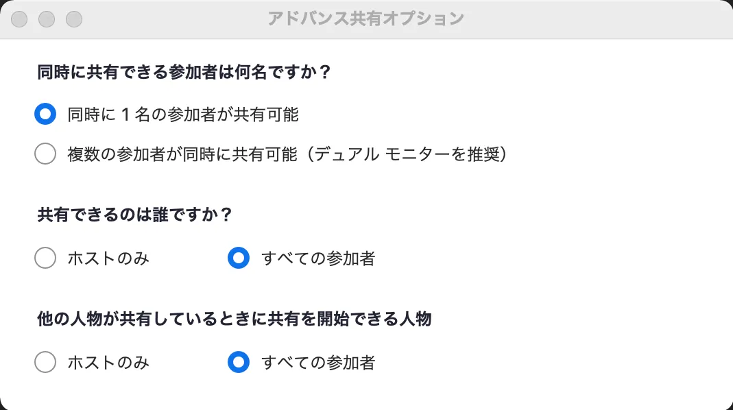 - 「他の人が共有している場合に共有を開始できるのは誰ですか?」:「全参加者」
